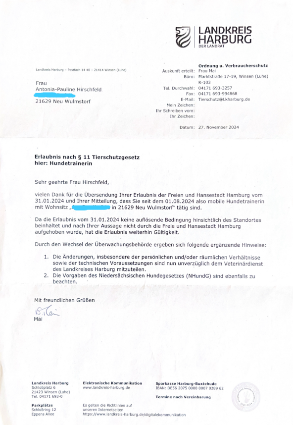 Im September 2023 schloss ich erfolgreich meine Ausbildung zur Hundetrainerin bei Ziemer und Falke ab und bin nun sehr glücklich, Trainings in eigenem Namen anbieten zu dürfen.